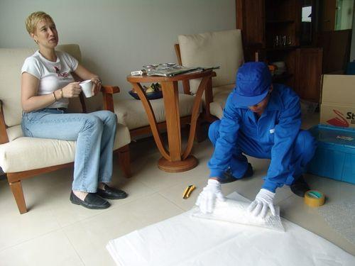 到達(dá)目的地后鋪設(shè)地板保護(hù)材料后開(kāi)始工作